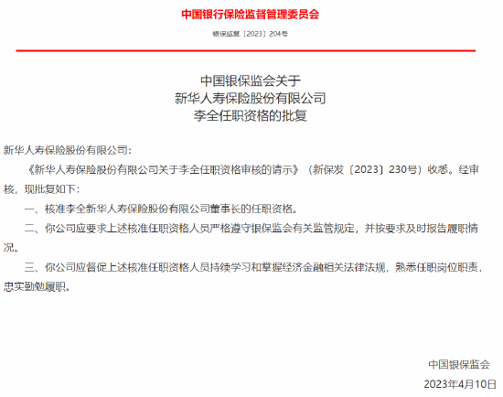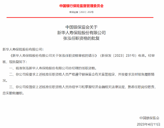 6月13日金融一线音书澳门银河真人百家乐,国度金融监督贬责总局网站当天发布批复透露,原中国银保监会核准李全新华东谈主寿保障股份有限公司董事长的任职经验、核准张泓新华东谈主寿保障股份有限公司总司理的任职经验。
