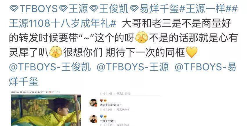 另外,有莫得发现,老迈和老三的标点象征都是雷同的,王源发新歌,老迈和老三筹商好帮他宣传,连标点象征都雷同,这是不是你们说好的剖析?无谓怀疑,他们一定是在群里筹商好了,再过一天就王源的生辰了,回家的源哥应该会和在重庆拍戏的老迈一皆过生辰吧,千玺这个弟弟预计就只可在生辰会上碰头了,一皆期待他们合体吧。