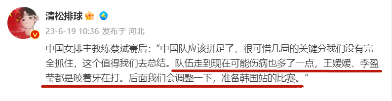 在第二周世联赛打完之后,其实蔡斌在接纳采访的时候也发表了我方的主见,并书记了惊喜决定,蔡斌露出:中国队应该拼足了,很可惜几局的要津分咱们莫得填塞收拢,这个值得咱们去总结。队伍走到当今可能伤病也多了少量,王媛媛、李盈莹齐是咬着牙在打。后头咱们会调遣一下,准备韩国站的比赛。